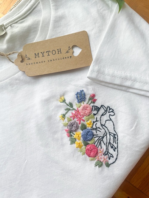 Vyshto is behind this embroidery tshirt, which features a hand with a red flower. You can gift it to your best friends or make it for yourself.