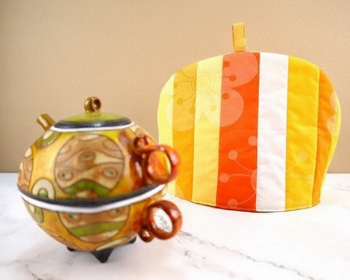 Have a look on this colorful teapot cozy from hellosewing. Thus will keep your tea pot warm and protect your delicate tabletops from heat damage. It can be a perfect small project idea that can be completed in an afternoon.