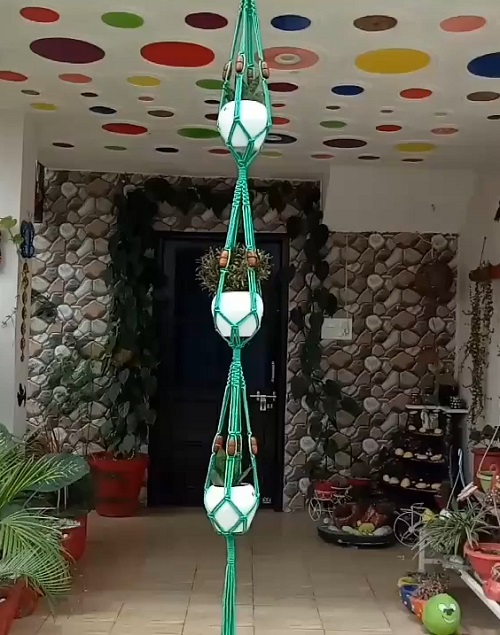 Make this beautiful 3-tier plant pod from BOCHIKNOT. To knot this, you need to work on larks head, half hitch, double hitch and square knotting techniques.
