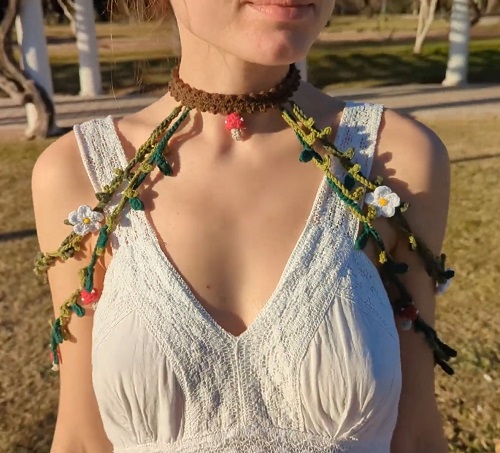 This crocheted ivy choker wraps gracefully around the neck. The flowy vines with flowers and leaves make it more attractive. Moody Juice Crochet is behind this nature-inspired accessory.