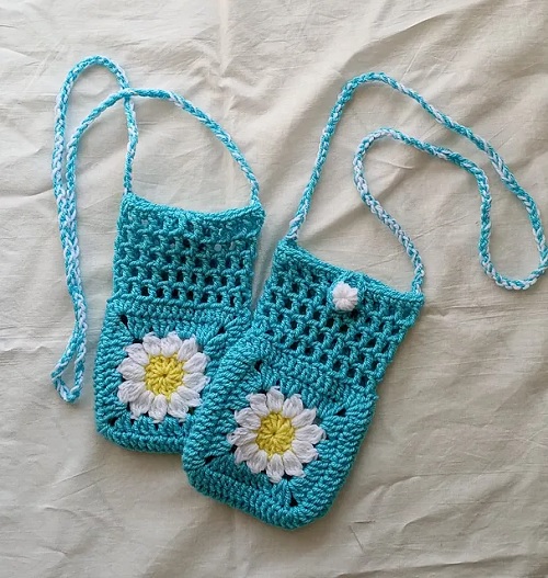The daisy phone bag by Clorade Knots is an outstanding accessory. It features a granny square with a daisy motif in the center.