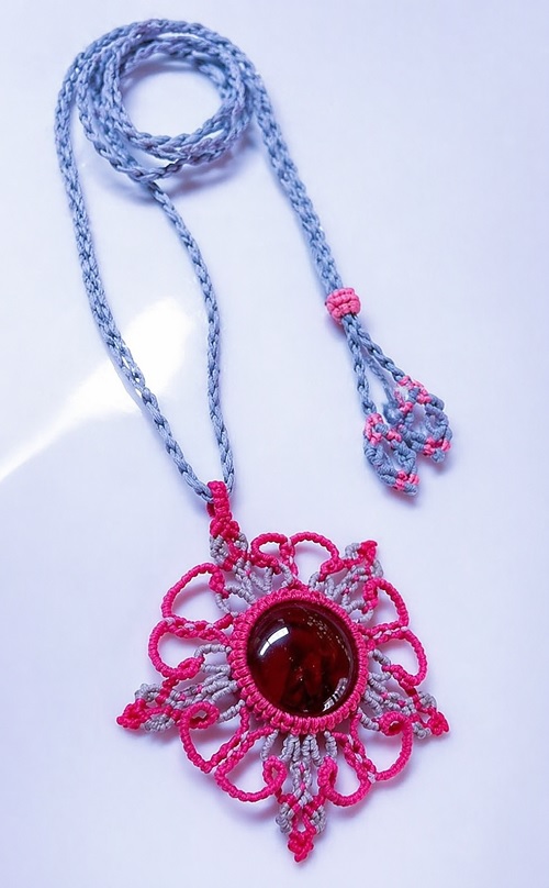 This flower pendant may look complicated, but it’s quite easy to make with MACRAME TITA’s tutorial. The knots are arranged in a way that creates a petal-like shape around the center gemstone.
