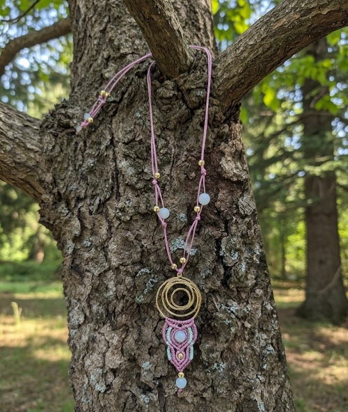 Try your hand at this beautiful necklace by Bijou MadaМe Macramé. The main highlight of this jewelry is the donut-shaped gemstone pendant. Quite quirky, right?