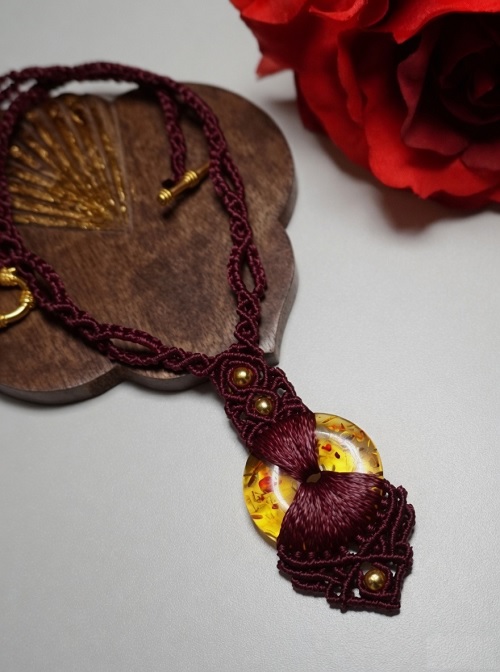 If you’re a fan of asymmetric design and large gemstones, check Bijou MadaМe Macrame’s pendant. It steals the spotlight with a drop-shaped cabochon in the center.