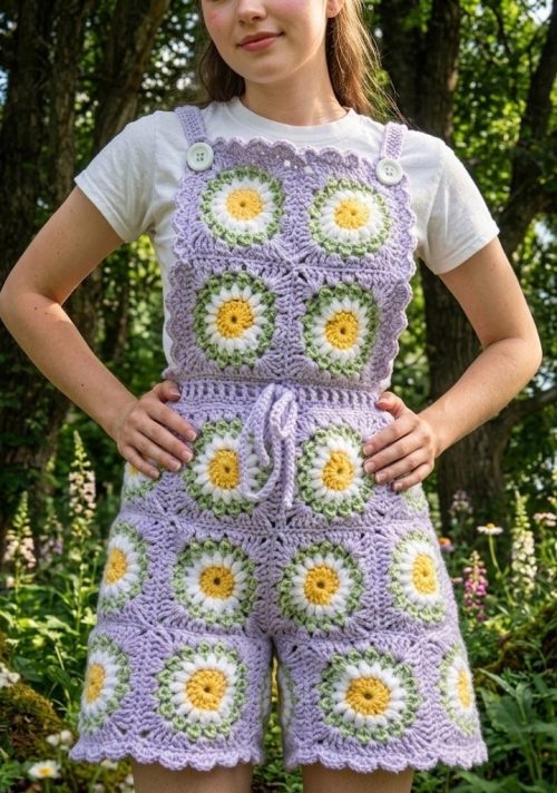 Savannah Price has created this stunning spring outfit with daisy motifs. The creator mostly used a staple starburst granny square. An amazing wearable to make for your next picnic or outdoor party.