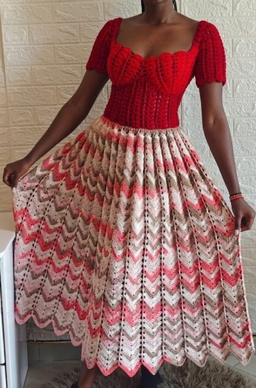 Try this beautiful long dress designed by Shylercrochets. It features a bustier style and pleated skirt, perfect for intermediate skill level crocheters. This can be a great gift too.