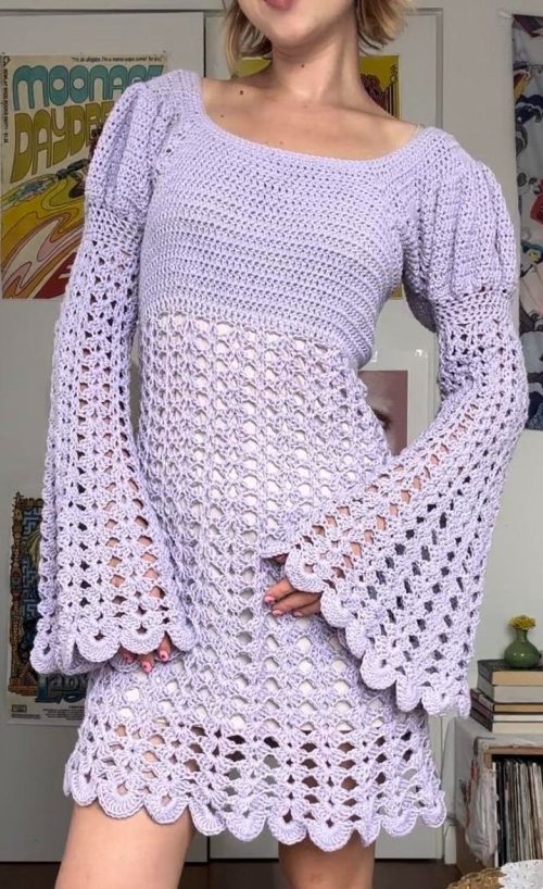 Have a look at this classy lacey lavender colored juliette dress. The main attraction of the pattern is the bell sleeves. You can gift it to your loved one or bff on their birthday. Grab the instructions from D. Carlen.