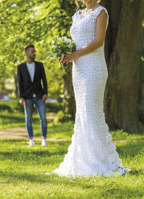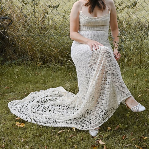 An elegant wedding dress from Anna Veda. It features intricate lace work and a flowing, classic silhouette, making it a dream project for any crocheter.